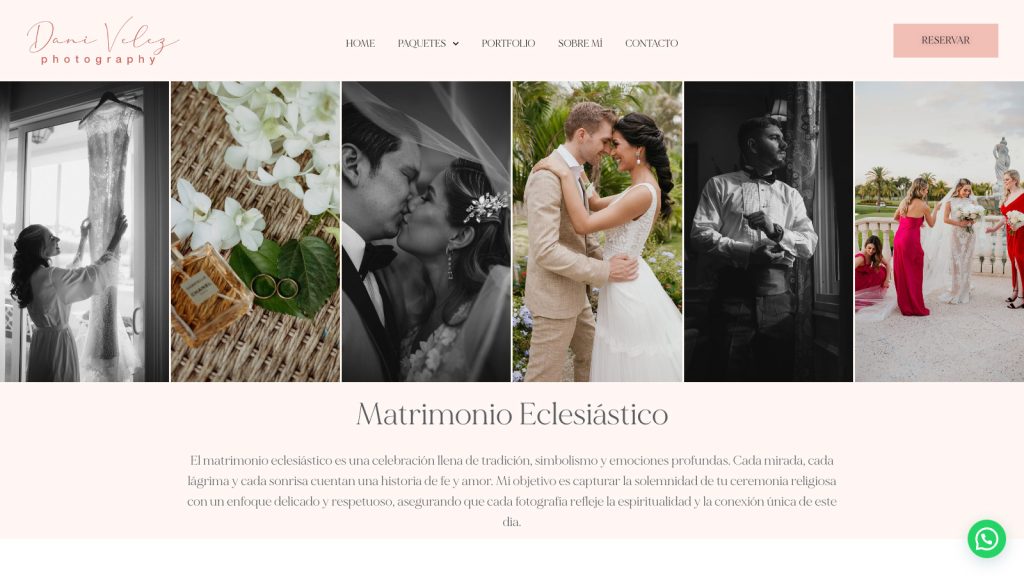 El sitio web de Daniela Vélez Fotografía ha sido diseñado para reflejar la esencia de su trabajo como fotógrafa especializada en matrimonios. La plataforma presenta una estética limpia y elegante, donde las imágenes son el centro de atención. Desde la portada, los visitantes pueden explorar fácilmente sus servicios, admirar su portafolio y obtener información clara sobre los paquetes ofrecidos. Además, la navegación intuitiva y el diseño responsivo aseguran una experiencia fluida tanto en dispositivos móviles como en pantallas de escritorio.