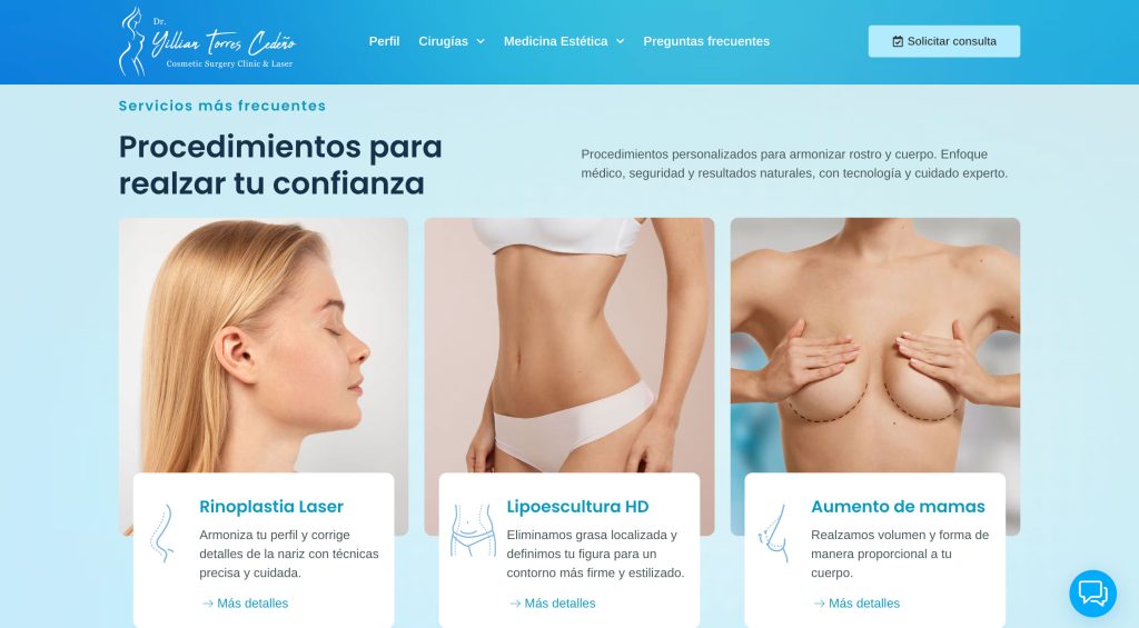 El trabajo de rediseño web para el Dr. Yillian Torres, incluyó un diseño responsivo que se adapta a cualquier dispositivo, optimizando la experiencia de usuario tanto en computadoras de escritorio como en móviles. El sitio fue desarrollado con un enfoque en velocidad y optimización para motores de búsqueda (SEO), asegurando que tenga una mayor visibilidad en línea. Se integraron herramientas de análisis para monitorear el tráfico web y mejorar continuamente la experiencia del usuario. Además, el sitio incluye medidas de seguridad avanzadas para proteger la información personal de los usuarios, garantizando un entorno confiable y seguro para la interacción en línea.