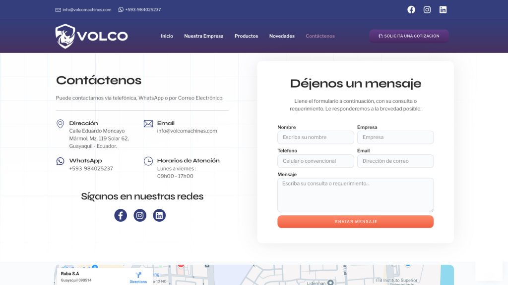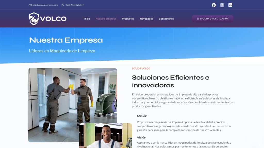 El trabajo de desarrollo web para Volco Machines, incluyó un diseño responsivo que se adapta a cualquier dispositivo, optimizando la experiencia de usuario tanto en computadoras de escritorio como en móviles. El sitio fue desarrollado con un enfoque en velocidad y optimización para motores de búsqueda (SEO), asegurando que Volco Machines tenga una mayor visibilidad en línea. Se integraron herramientas de análisis para monitorear el tráfico web y mejorar continuamente la experiencia del usuario. Además, el sitio incluye medidas de seguridad avanzadas para proteger la información personal de los usuarios, garantizando un entorno confiable y seguro para la interacción en línea.